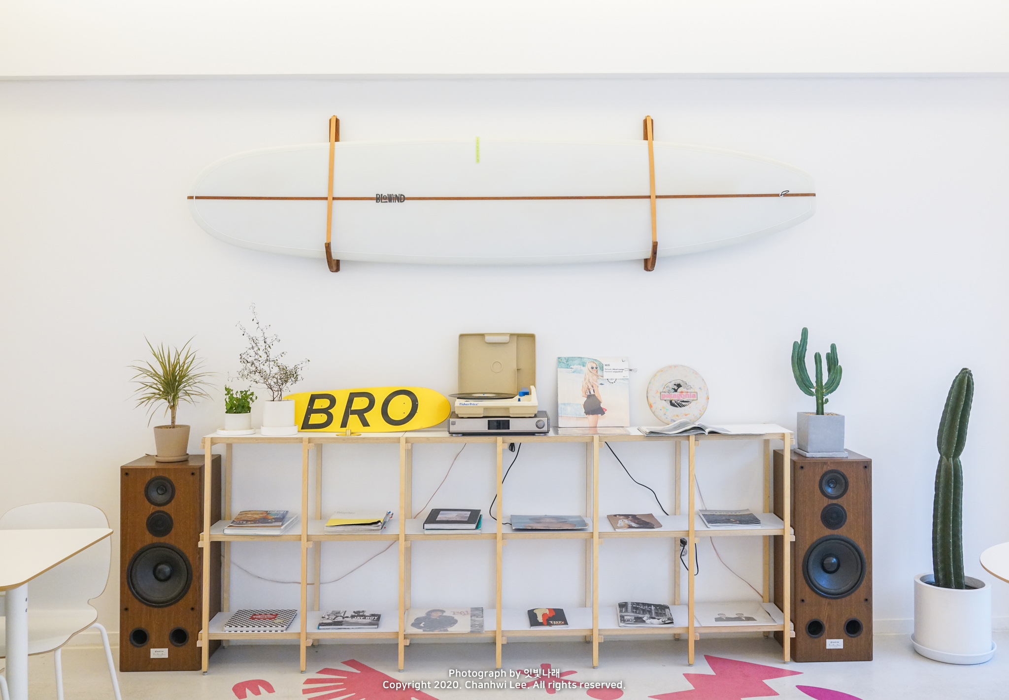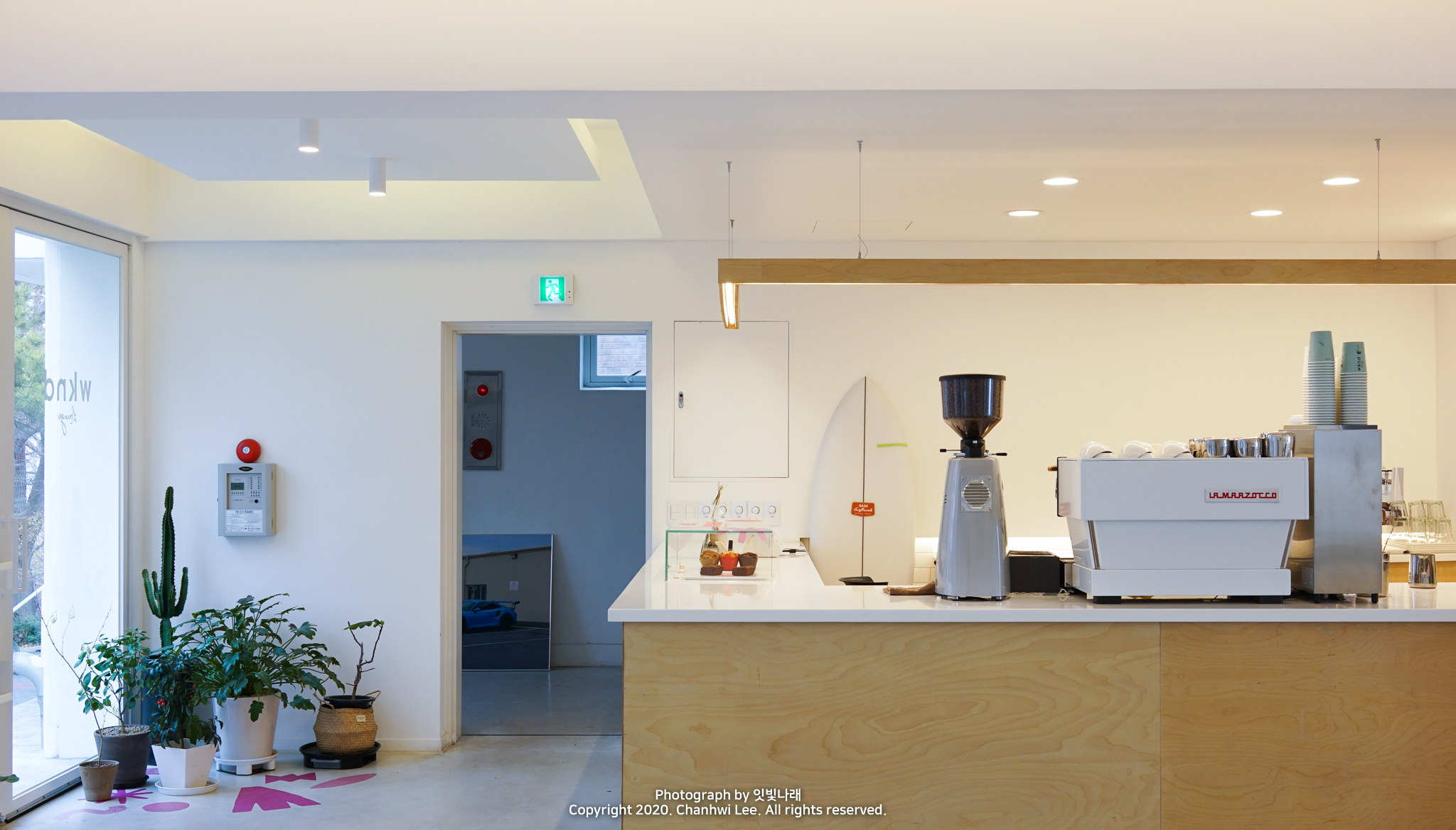 안쪽도 깔끔한 편, 카운터에 놓인 서퍼 보드가 인상적이었어요. 머신은 라마르조꼬 리네아 2그룹. 왼쪽에 보이는 곳으로 2층으로 올라갈 수 있었네요.