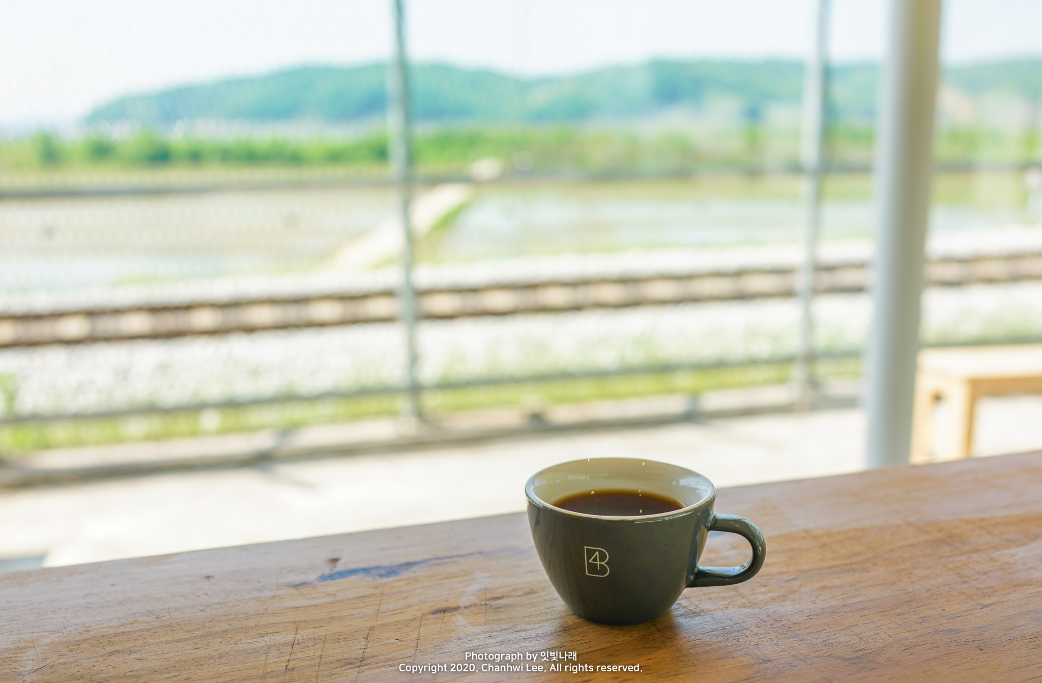 잠깐 멍 때리다가 온두라스 드립 한잔 더 :) 밖으로 보이는 배경이 푸릇푸릇, 앞에 보이는 건 철로예요.