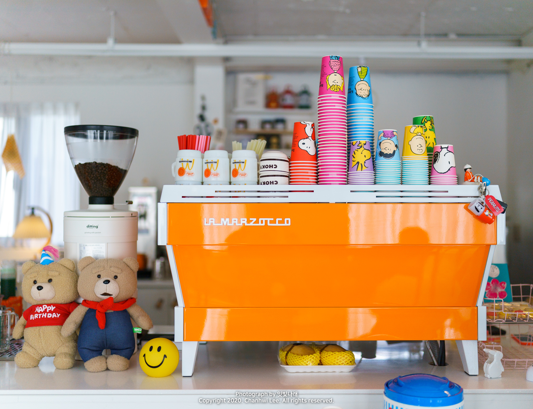에스프레소 머신은 꽤나 좋은 걸 쓰고 계셨어요. 이색으로 칠해진 건 처음 봤어요. 위를 빼곡히 채운 스누피 컵들.